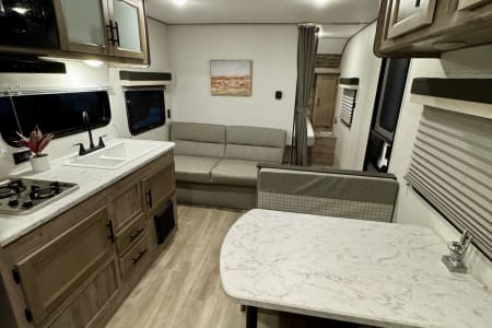 This cozy camper sleeps 4 adults or 2 adults with 4 kids (depending on how much you like each other). Comes stocked with kitchen essentials, chairs, bedding, and toiletries – just bring your snacks and your sense of adventure.