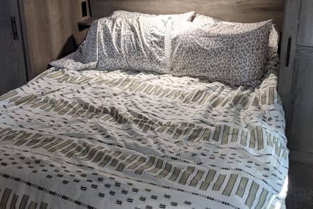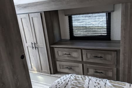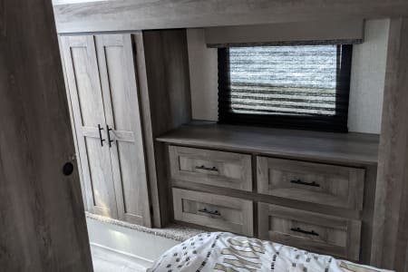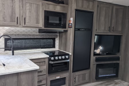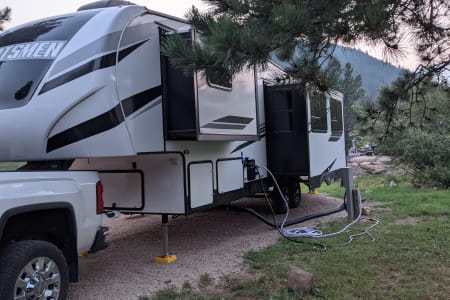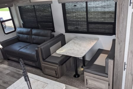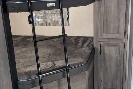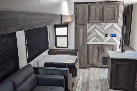 Newer 5th wheel camper with a spacious layout. Master bedroom with queen bed and upgraded mattress. 2 queen bunk beds. 1 fold fold down beds. Sleeps up to 9 people. Dinette with comfortable seating for up to 4 people. Fully equipped kitchen with refrigerator and freezer, 3 burner stove, oven, microwave and kitchen sink.