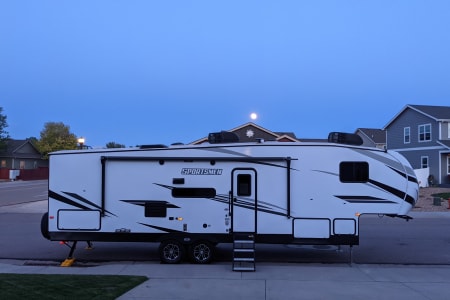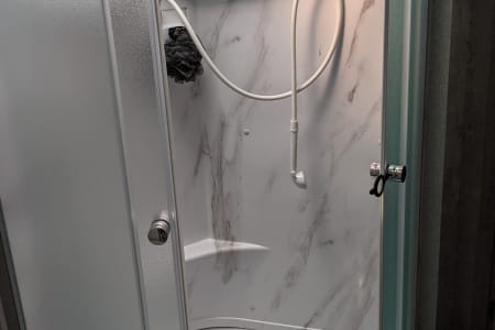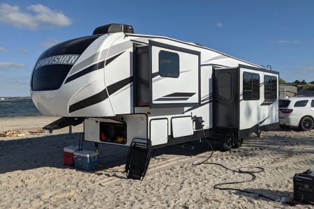 Indoor and outdoor showers. One bathroom. Indoor/outdoor sound system. TV. Retractable awning with LED lights. Outdoor rug. Full size, stable entry stairs with handrail.