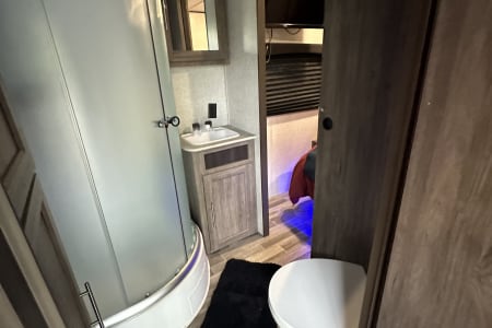 Outdoor space abounds with this camper so take in the scenery under the two awnings with music from the outdoor speakers. The outdoor kitchen offers a built-in, pull-out two burner cooktop, sink, and a mini fridge to keep cold drinks close. The kids can wash off with the outdoor shower before retiring to the large private bunk room with 4 additional beds. This room also boasts additional storage with a smart tv as well! No need for disturbing you because there is a separate half bath inside the bunk room!!