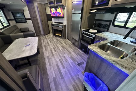 Enjoy the great outdoors in style with all the luxuries of home. This 37 foot camper with 2 slides provides space for up to 9 people. The private master features a queen bed, smart TV, dual closets, storage both above and under the bed, and direct access to the main bathroom. There you will find shower with skylight, sink with mirrored medicine cabinet, pedal flush toilet, and linen closet. The bathroom also has a second entry from the hallway. The main cabin has a u-shaped dinette and a comfy couch, both of which convert to beds. While cooking in the large stocked kitchen with fridge, 3 burner stove, oven, microwave, and pantry, enjoy music from the sound bar. Later, watch a movie on another smart TV while relaxing in front of the LED lit fireplace.