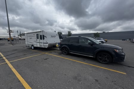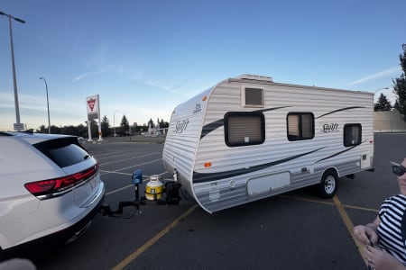 This trailer has been towed all over Alberta and British Columbia by a wide range of renter vehicles over the past year including SUVs, crossovers, minivans, and half ton trucks. It is light, well balanced, and stable on the highway. We include sway bars and a weight distribution hitch for peace of mind.