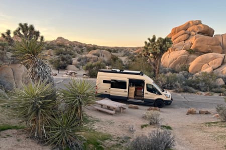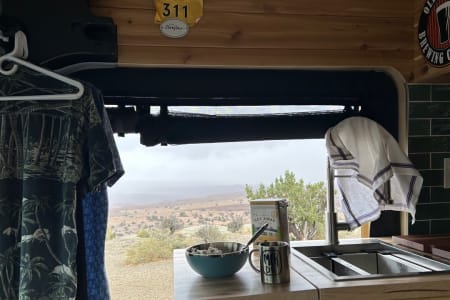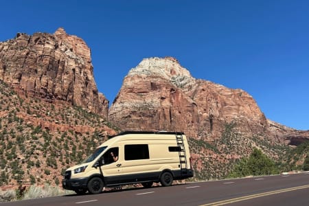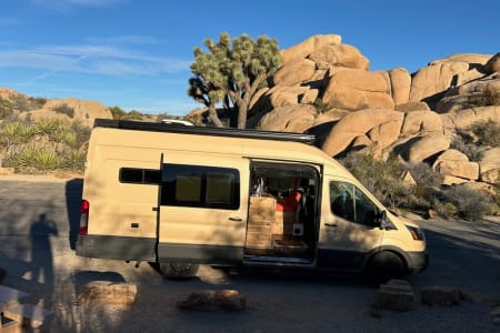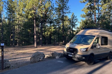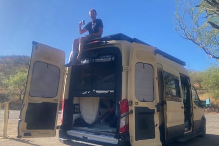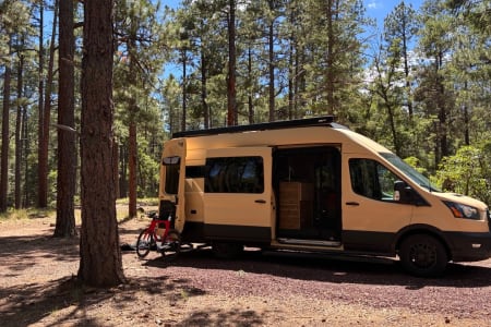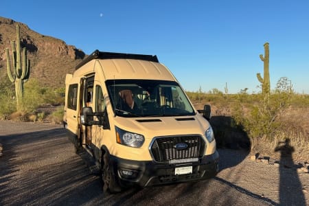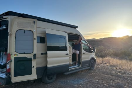 The Lonely Cactus is a Ford Transit 4x4 with a custom interior build, complete with roof solar panels, a freshwater tank with a water heater, air conditioning, and gas powered interior heating. It's equipped with everything you need for your next adventure, whether you're admiring saguaros in the Sonoran desert, climbing peaks in the ponderosa pines, or tackling switchbacks in the Grand Canyon.