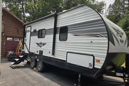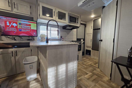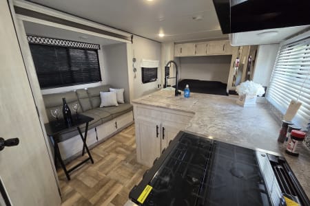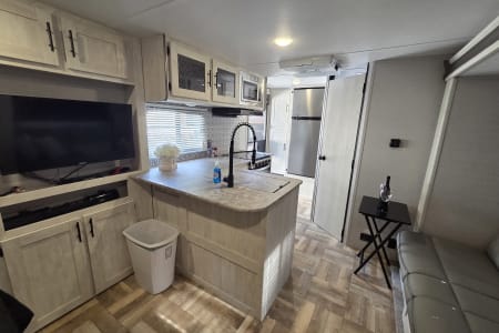This unit is small but has so much to offer. Tons and tons of storage for a long trip. A decent size bathroom with a nice shower! Fully loaded kitchen and lines and towels included as well as two camp chairs.