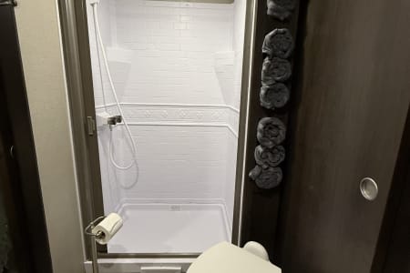 Private master bedroom with brand new queen size mattress and luxury mattress topper, plenty of storage in bedside cabinets, overhead storage and storage under the bed to store all your clothes and personal belongings. Bathroom is located off of main bedroom and off of living area. We provide Towels, washcloths, a hair dryer, a small supply of toiletries and RV toilet paper (REGULAR TOILET PAPER CANNOT BE USED, IT WILL DAMAGE THE SEPTIC SYSTEM)