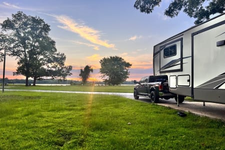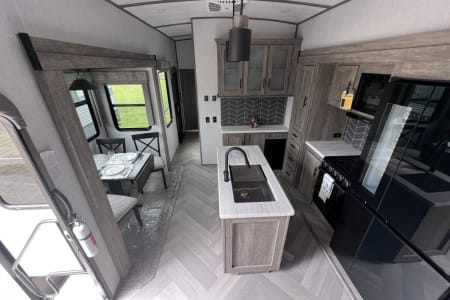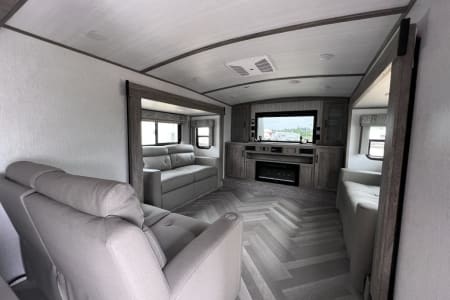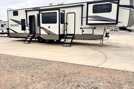 Enjoy a spacious, high-end getaway in our beautiful Salem Hemisphere 378FL fifth wheel RV – delivered and fully set up at your campsite, so all you have to do is relax!