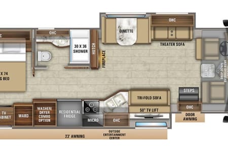 Step inside and enjoy an open, spacious layout with two large slide-outs, a cozy electric fireplace, and a 50” LED lift TV. The residential-style kitchen features a 21 cu. ft. refrigerator, convection microwave, solid-surface countertops, and a three-burner range—perfect for cooking up meals on the road. With sleeping space for up to 7 guests (king bed, tri-fold sofa, convertible dinette, and optional overhead bunk), everyone will have a comfortable place to rest after a day of adventure.