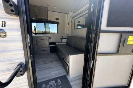 A perfect fit for your next vacation. Loveseat couch converts to Queen Size Murphy bed with Ease. Residential size kitchen sink with ample refrigerator and freezer space. Three burner stove, Oven and Microwave. Spacious shower with tub with separate vanity. Central Heating and Air conditioning. Flat Screen TV. Double size Bunks and Convertible dinette bed. NO SMOKING within RV and NO SAND DUNES.