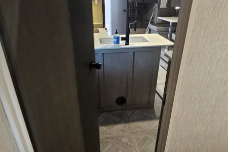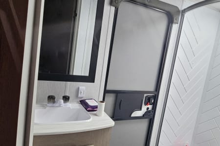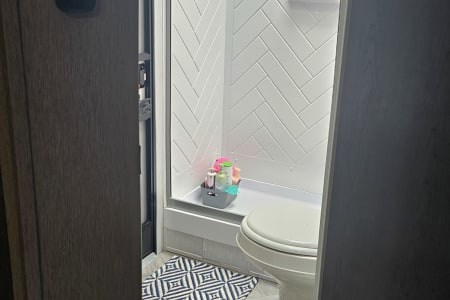 The bathroom includes a shower and a separate entrance/exit door, providing convenience and easy access.