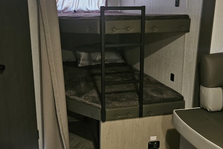 The rear of the trailer includes double over double bunks, perfect for kids or guests.