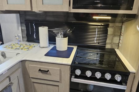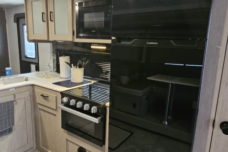 The kitchen is equipped with a pantry, a 11 cu. ft. refrigerator, a three-burner stovetop, and a microwave.