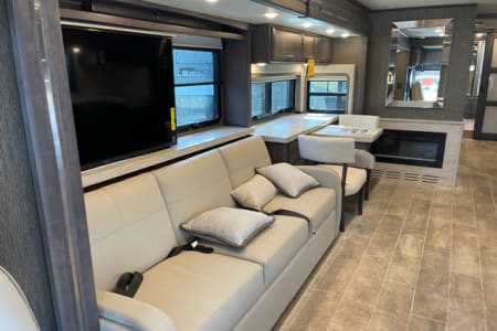 • Living Area Comfort: Includes ensemble sofa bed, Dream Dinette® booth, reclining theater seats with footrests, a 55″ retractable HD TV, and an electric fireplace under ambient lighting .