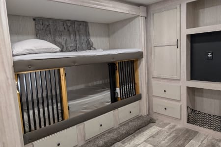 Spacious 2 bedroom and 1 and a 1/2 bath vacation home on wheels. This luxury unit sleeps 8-9 people. Queen bed in the master. A pull out couch in the living space. A private bunk house with 3 twin beds and a futon. 1 twin bed has been converted to a safe zone for the littlest of campers. This unit is for delivery and setup only. No towing needed. We set you up for a successful and restful trip! Just bring your bags and settle in! We are located in the center of some fantastic campgrounds including the following.