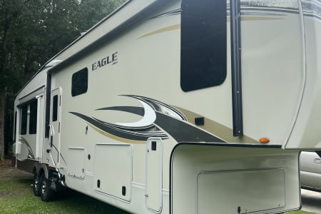 Jayco Eagle fifth wheel has a beautiful elegant walnut inside interior with tons of space and a mid-bunk! It even comes with an outside kitchenette that has extra counter space and an outside refrigerator.