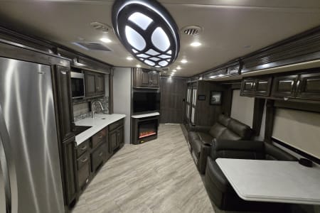Expansive Living Area: Relax on plush sofas, enjoy a cozy electric fireplace, or watch your favorite shows on the large smart TVs.