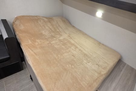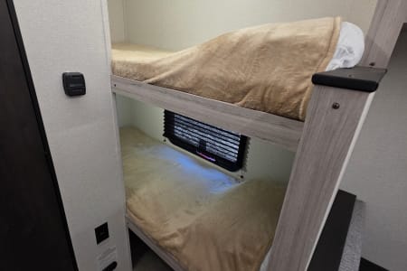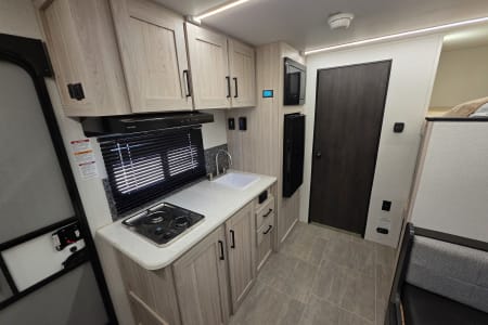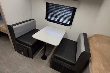 Super light weight (3400 pounds) towable with most small trucks and SUVs. Sleeps 5 with a queen bed in front, twin bunk beds in back, and the dinette turns into a comfortable sleeping area. This trailer is equipped with an outdoor LED strip, a 42 gallon fresh water tank, a 30 pound propane bottle to provide gas for the tankless water heater to give you hot water and keep the built in heater working so the trailer is toasty during the cold months. Has a 700 watt solar system, 24 Volt 100ah lithium battery, and a 3000 watt inverter.