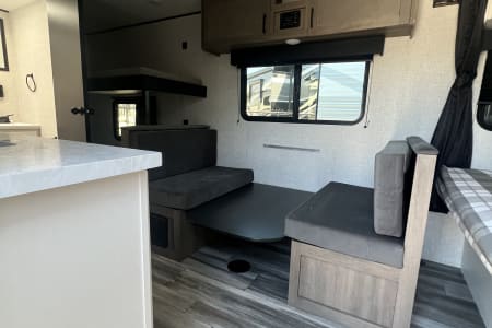 Sleeps up to 5 – Queen bed, bunk beds, and a convertible dinette