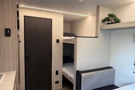 Enjoy the convenience of a full kitchen and bathroom, along with modern touches like interior LED strip lighting and a tankless water heater. Get ready for unforgettable journeys!