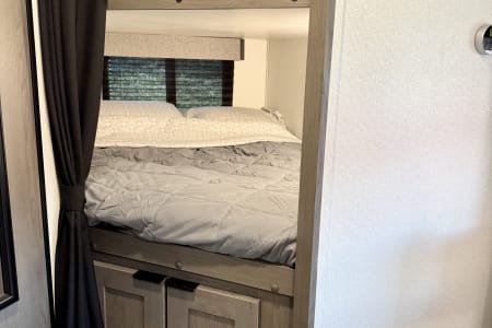 No need to pack much – this rental includes everything you need for a comfortable camping trip: fresh linens, towels, a well-stocked kitchen with basic cookware, dishes, and utensils. You'll enjoy the convenience of a modern kitchen inside, complete with a refrigerator, freezer, oven, stove, and microwave. For outdoor relaxation and cooking, there's a large electric awning with LED lights, exterior speakers, and even an outdoor blackstone grill.