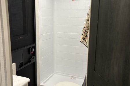 Stay fresh with a walk-in shower, toilet, and sink—all with tankless hot water heater.
