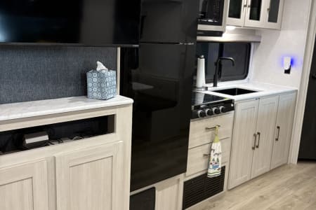 Includes a 3-burner stove, microwave/Convection oven/Air Fryer, and a refrigerator/freezer. Everything you need to cook your favorite meals on the road.
