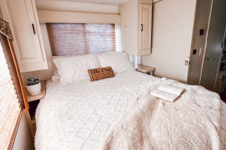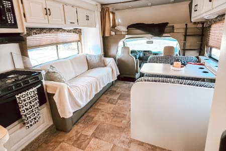 Come and stay in our beautiful RV available for your weekend and everyday needs and getaways. This RV boasts a beautiful interior and exterior layout that includes 2 full slides, appliance (oven, stove, and microwave), over under refrigerator, mid size pantry, plenty of storage, reclining couch, over head sleeping! Bedroom includes a Queen size bed. Full size bathroom with shower. Outdoor entertainment includes one awning, bluetooth radio, and tv.
