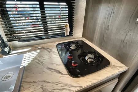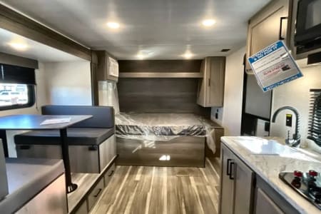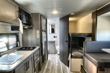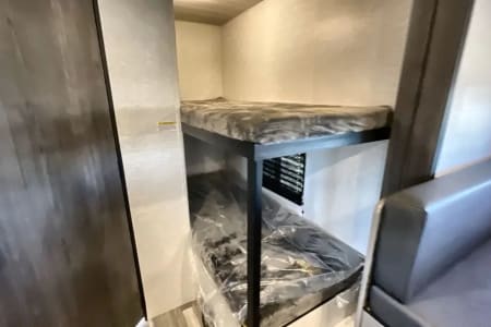 Sweet little camper with everything you need to enjoy the outdoors in absolute comfort. Upgrades to full mattress and top bunk to allow comfort and access. Storage available above the bed, in the closet and under the bed to ensure you have the most space to enjoy your time while inside. Endless water heater ensures a comfortable shower if you need it!