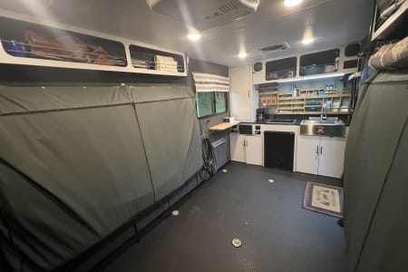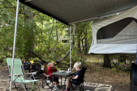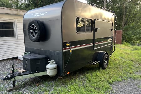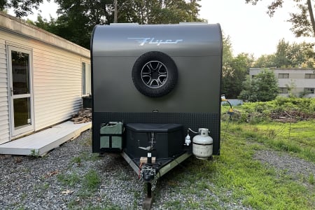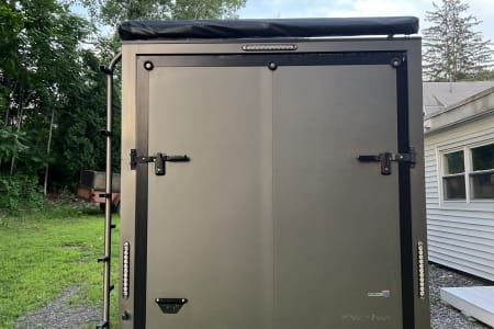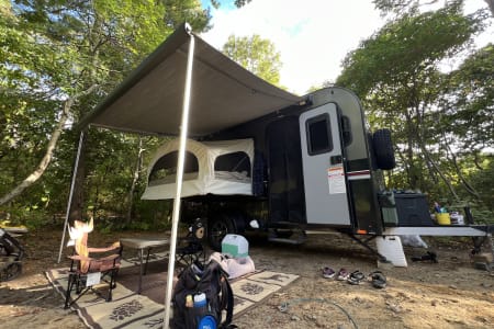 This toy hauler does the heavy lifting for you - load up the RV with your bikes, kayak, gear, chairs, and save legroom in your vehicle. Once you get to your campsite, empty the gear through the convenient full rear drop down ramp door and enjoy the openness that is a toy hauler camper. Set up chairs and table for snacks and a card game, clear the space out for some space for an extra air mattress, you can make it what you want. Both sides of the camper have pop outs with mattresses and screen doors to feel the outdoors from the comfort of the raised mattress in the camper. The kitchen is fully stocked with a propane cook surface, kitchen sink, coffee maker, and all the cookware/utensils. A side awning and outdoor mat make for a nice outdoor hang spot. There is solar on the roof to keep the charge going, or plug into electric. Enjoy the adventure!