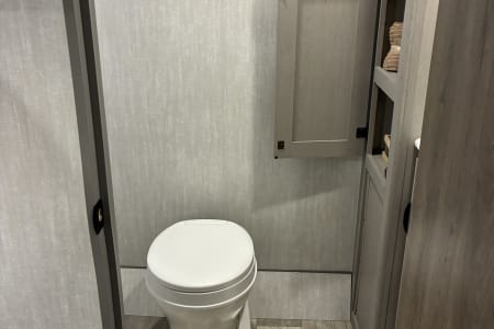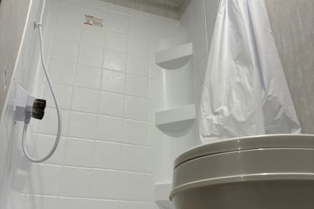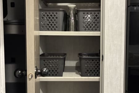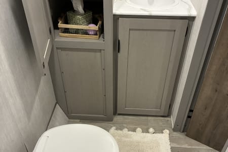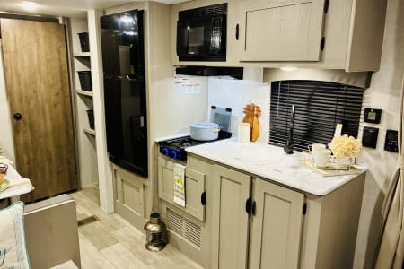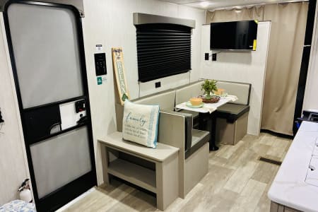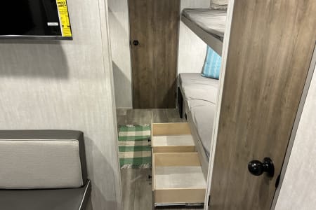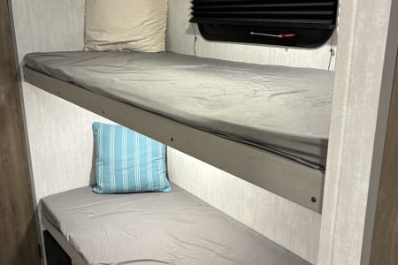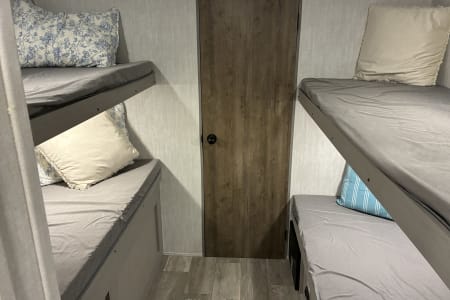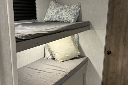 Come enjoy your camping trip with our family friendly travel trailer. Rv has full size bathroom, 4 bunk beds, dinette that turns into a bed and a queen size bed to sleep the whole family. Compact kitchen includes sink, 2 burner stove, microwave, huge fridge with plenty of pantry space.