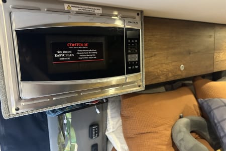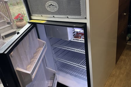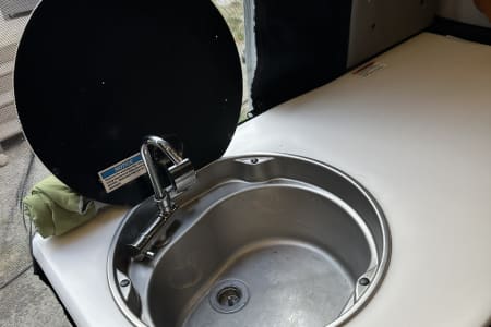 The van has a kitchen with sink, fridge, a portable induction stove top, comes with pots and pans, dishes. It also has an indoor shower that is folding out / stowing away in one of the overhead cabinets.
