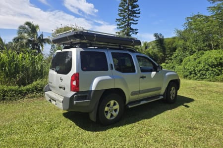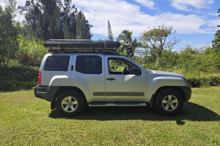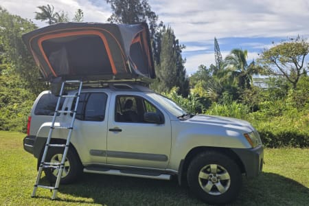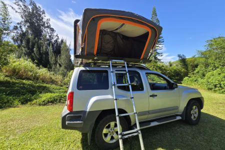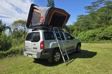 Our Nissan Xterra off-road 4X4 vehicle comes equipped with a premium hard-top hydraulic roof tent with a 3 step easy setup.