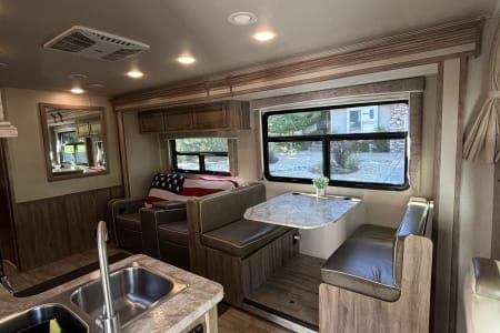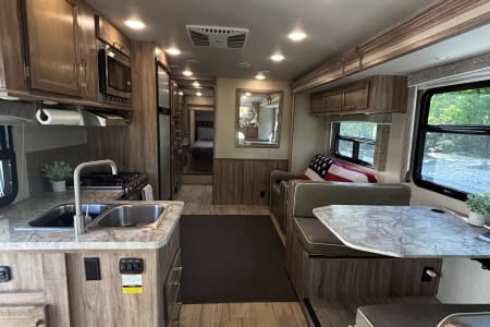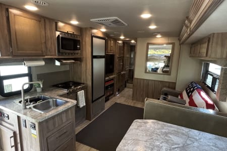 • Modern Kitchen: Cook delicious meals on the road with a 3-burner stove, oven, microwave, full refrigerator/freezer, and plenty of counter space.
