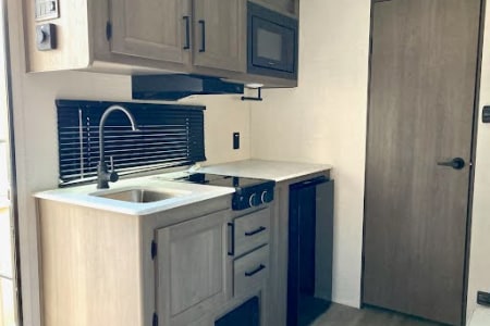 Compact full galley kitchen equipped with a 2‑burner cooktop, microwave, and 3.3 cu ft glass‑front 12 V refrigerator