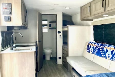 Two 28″ × 67″ bunk beds at the rear, right next to the private bathroom