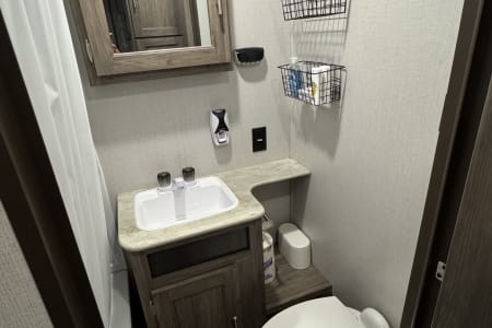 Comfortable Living Area: Boasts a U-shaped dinette that converts into a sleeper, a sleeper sofa, an entertainment center with a soundbar and 30-inch fireplace, and ample storage throughout.
