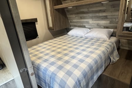 Exterior Enhancements: Equipped with radial tires, Keyed-A-Like door locks, a power awning with LED lighting, power tongue and stabilizer jacks, and an outside shower.