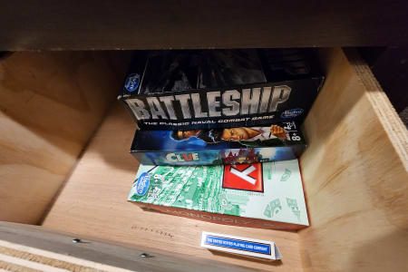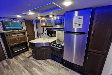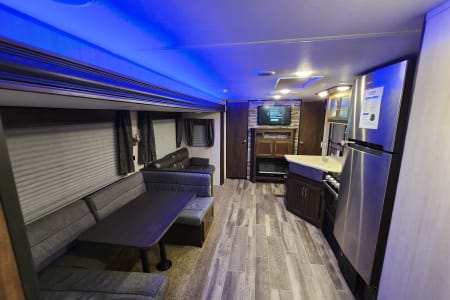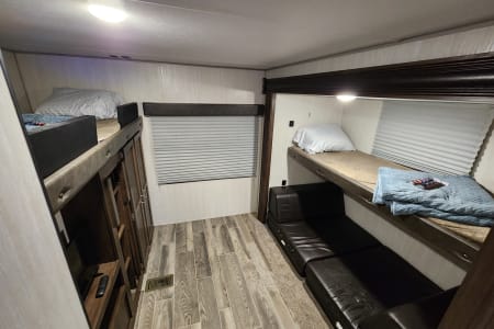 Private bedroom with queen bed in the front. Bunkhouse with a door in the back featuring 3 bunk beds and smart TV for the kids.