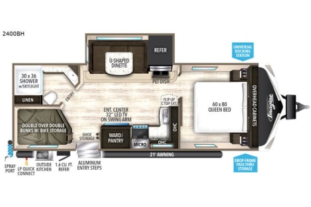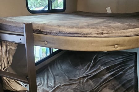 Hi, I’m so excited to be your home-on-wheels for your next big adventure! I’ve got room for the whole crew—with a cozy queen bed for the grown-ups, two double-size bunks for the kiddos (or fun-loving adults!), and a big U-shaped dinette that transforms into another comfy bed.