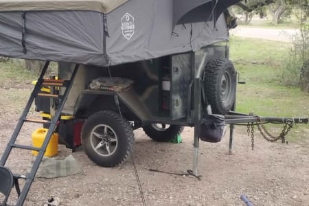 This is a very cool overlanding trailer with storage and an Overland Vehicle Systems Nomadic 4 RTT, it has a 3" memory foam cushion and it has an awning that you can set up
