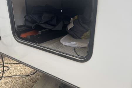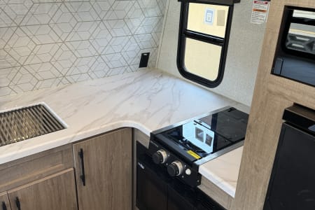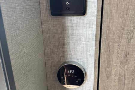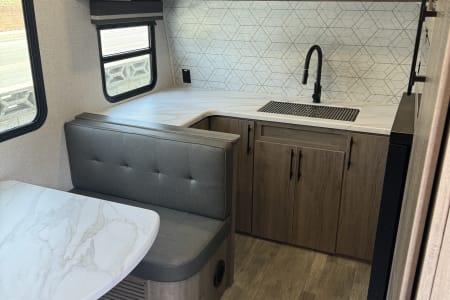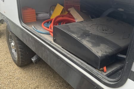 Outside features a gas connection for the Blackstone griddle. Outdoor shower. Tons of storage space. Solar panels will allow limited boon-docking and do a great job re-charging batteries during the day. Inverter makes all plugs operate like normal while on batteries.