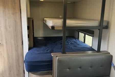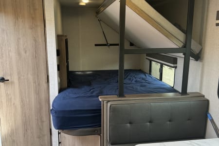 Is very comfortable with an upgraded 12” Queen mattress. Upper twin bunk that can be pushed out of the way when not in use. Dinette also transforms into a twin sized sleeping area.