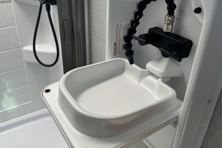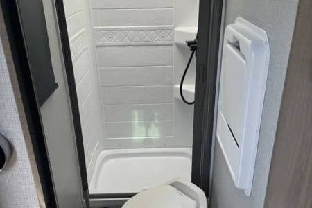 Bathroom has toilet, shower and pull down sink. Shower is spacious and can accommodate a 6 foot tall person easily