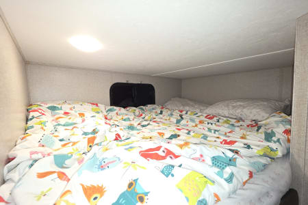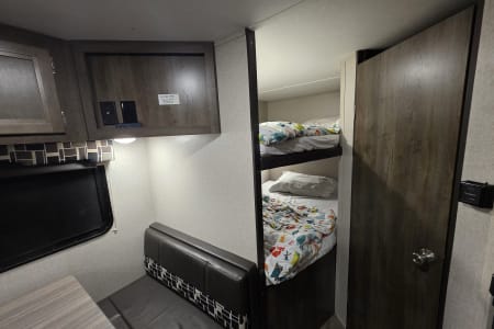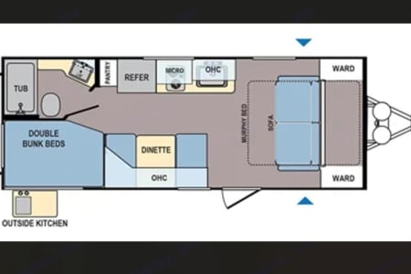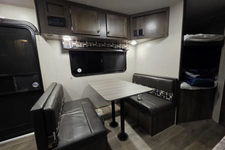 - Features a queen Murphy bed, two full bunk beds, and a dinette bed to comfortably sleep 7. Full bathroom, huge fridge, and freezer.