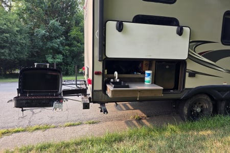 - Outdoor kitchen with mini outdoor fridge, a mini sink and a small gas grill.