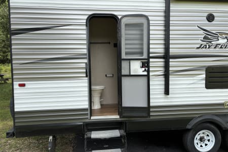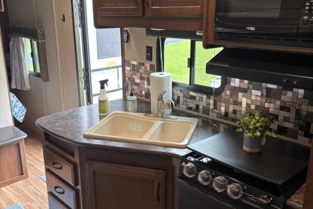 Escape in comfort with the spacious camper. Perfect for a family adventure or a friends getaway. Sleep up to 10 with a private queen, full sized bunks, a convertible dinette and a comfy sofa. Enjoy modern conveniences like a full kitchen, large fridge, and a roomy bathroom with its own exterior entry for easy access. This large open floor plan gives you lots of space to spread out and relax.