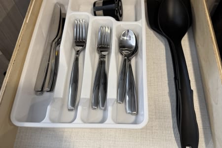 • Fully stocked kitchen – coffee maker, air fryer, pots, pans, utensils, plates, cups