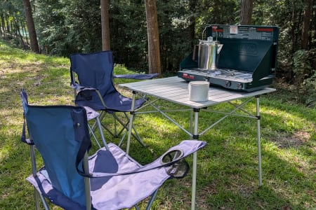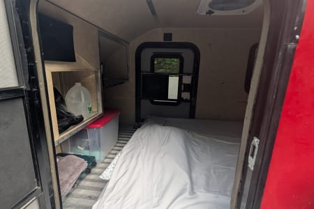 Throw your kayaks on the roof rack for a fun weekend adventure. With a dry weight of only 850 lbs, this camper can be towed by most vehicles equipped with a hitch. It provides all the comfort and allows the convenience of not having to set up a tent so you can spend more time relaxing or exploring on your camping trip. The interior has a comfortable full size bed, lights and outlets for charging devices. Equipped with a portable gas stove and a camping coffee maker, you can enjoy a hot meal and a cup of coffee anytime.