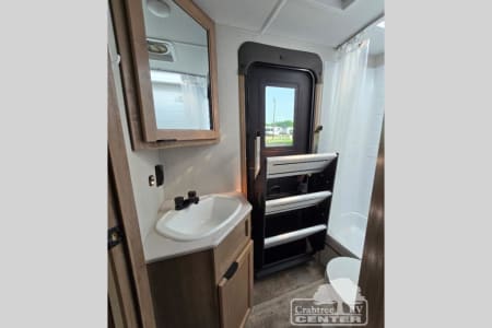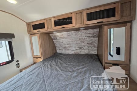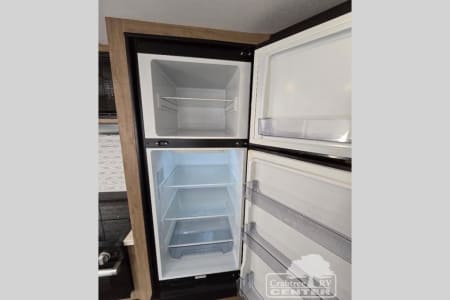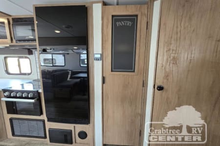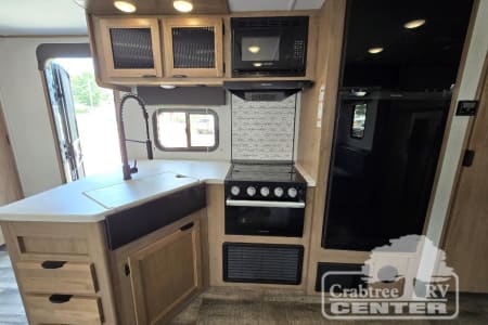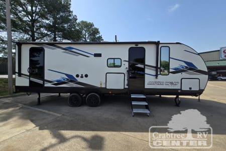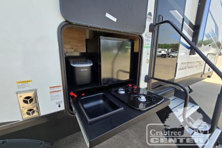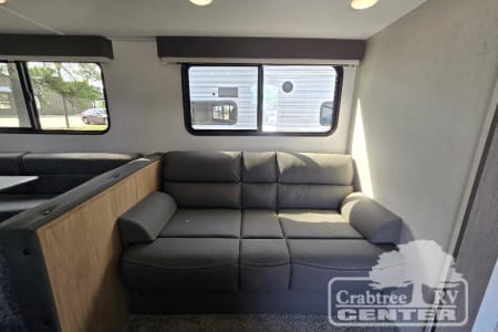 Looking for a multi-sleeper trailer to sleep nine to ten happy campers? You've found it in this dual entry model with a deluxe outside kitchen, double-size bunks, and a large slide out! The main living and kitchen area has a U-shaped dinette to utilize as a dining table, game table, work station, and/or an extra sleeping space. You will also find a pantry and full kitchen amenities including a farm-style sink, and a residential refrigerator. The exterior provides a 20' awning for an outdoor living area, outside storage, plus large steps with oversized landing and quick release for convenience.