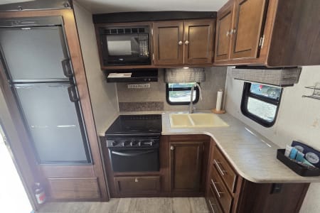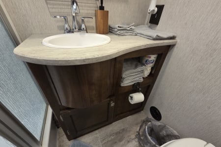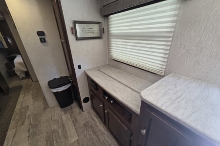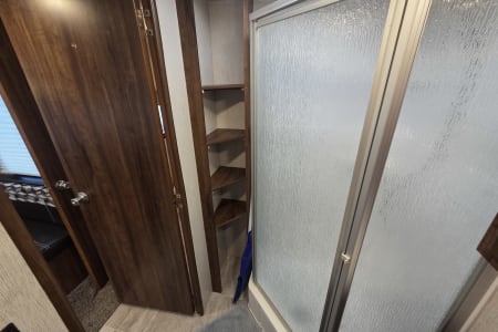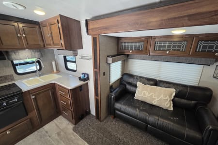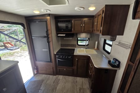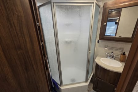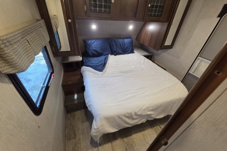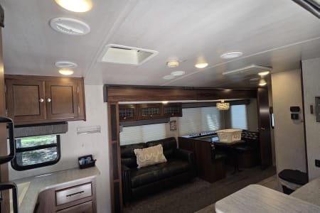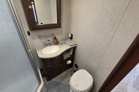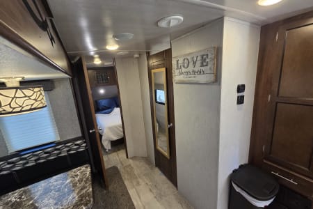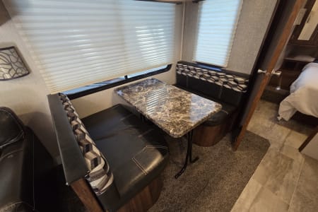 This 30 amp camper is fully equipped with kitchen, bedroom, bathroom and dining room.