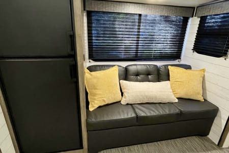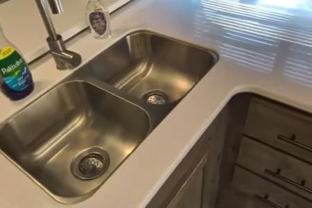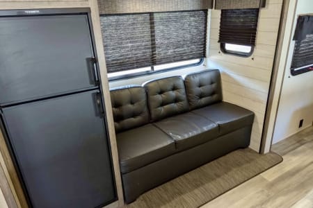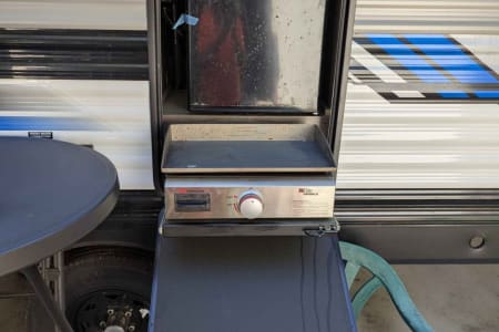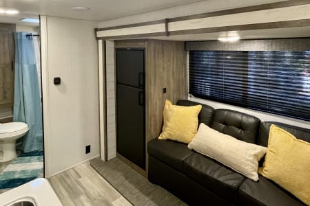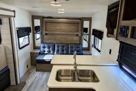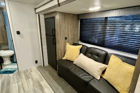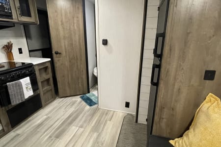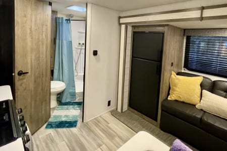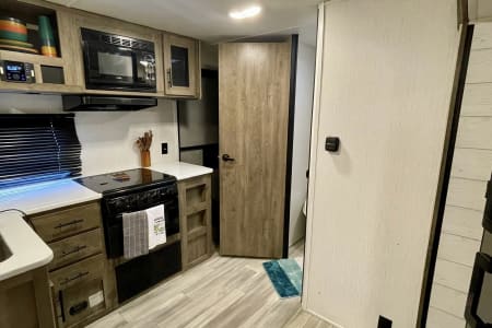 The shower is full size and has a round bar to allow more space. Bathroom is also full size! Plenty of storage. The Kitchen has a convection Stove/Oven, microwave, full size- 2 compartment sink and comes with everything you need to cook except the food! Theres even an outdoor kitchen with a griddle and mini fridge that is great for making the bacon, or your breakfast of choice. It has 2 propane tanks for longer reservations. 30 Amp hookup or rent our 30 amp gas powered generator to go off the grid. We also have Starlink available for internet anywhere!